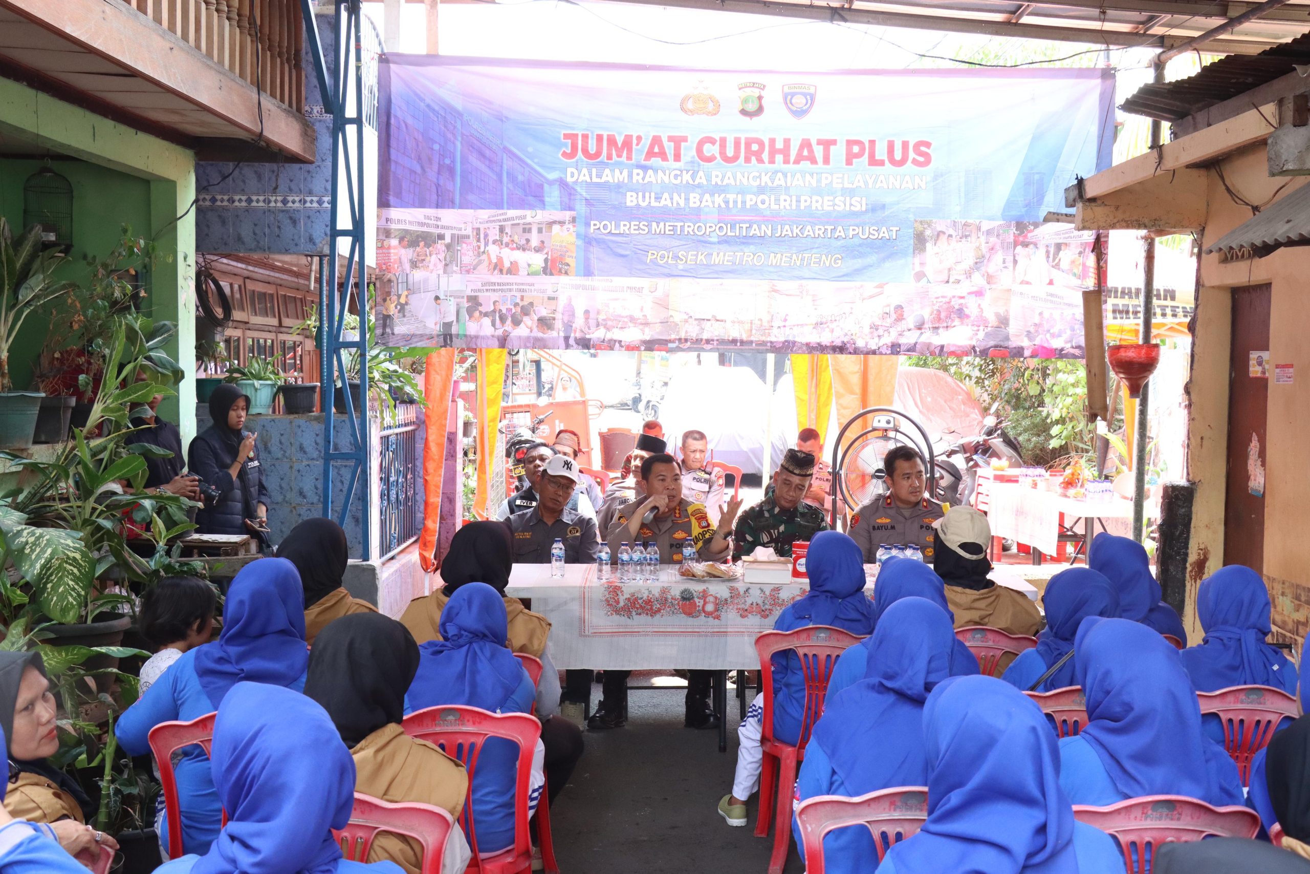 Jakarta Pusat – Kapolres Metro Jakarta Pusat Kombes Pol Susatyo Purnomo Condro bersama 3 Pilar melaksanakan kegiatan Jum’at Curhat Plus di RT 09/02 Kelurahan Menteng Tenggulun Kecamatan Menteng Jakarta Pusat. Jum’at (20/9/2024).