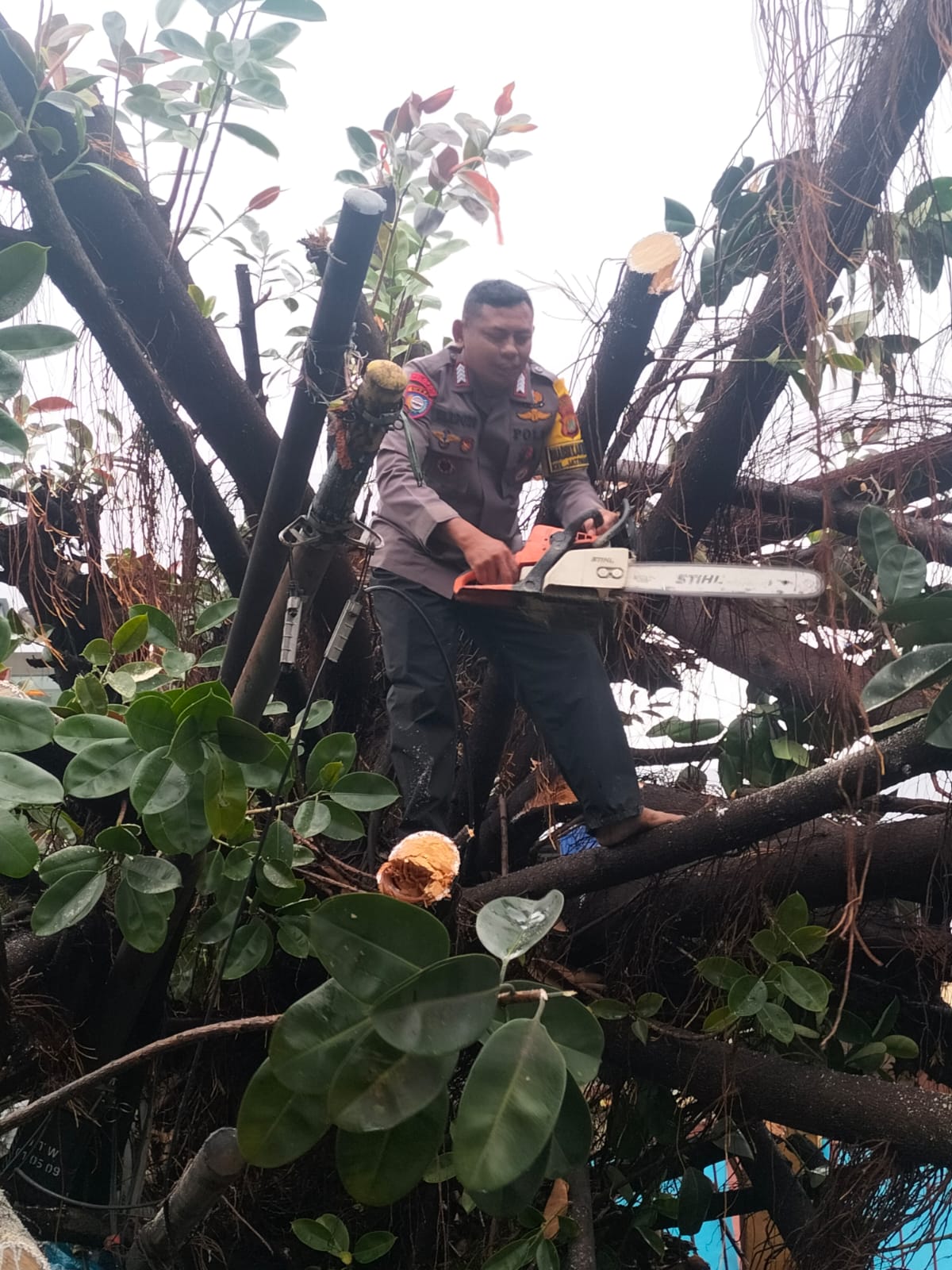 Aksi Heroik Bhabinkamtibmas Jatiwaringain Bripka Wardoyo Evakuasi Korban dan Pohon Tumbang di Pondok Gede