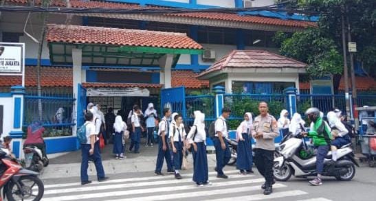Jakarta Pusat – Kapolsubsektor Rawasari Aiptu Prayogo melaksanakan patroli ke sekolah untuk memberikan rasa aman kepada pelajar saat jam pulang sekolah di SMP Negeri 118 Jakarta Cempaka Putih Jakarta Pusat. Selasa (8/10/2024).