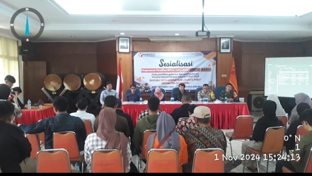 Jakarta Pusat – Bhabinkamtibmas Kelurahan Johar Baru Aiptu Sunarto bersama Tiga Pilar, menghadiri sosialisasi pengawasan pemilihan tatap muka yang diadakan melalui forum warga menjelang Pilkada. Di Aula Lantai III Kantor Kelurahan Johar Baru, Jalan Johar Baru Utara I RT 12 RW 03 Kelurahan Johar Baru, Kecamatan Johar Baru Jakarta Pusat. Jumat (01/11/2024).