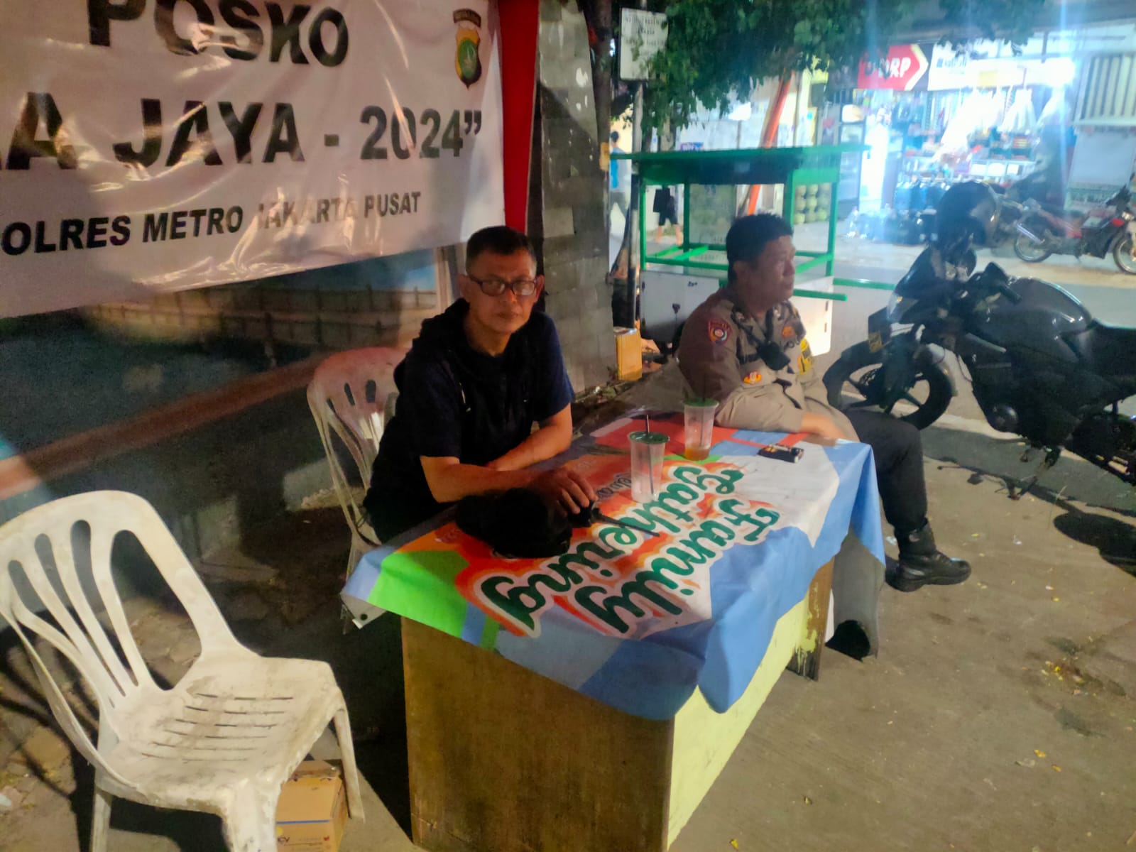 Jakarta Pusat – Aiptu Ujang Rusman Bhabinkamtibmas Kebon Sirih Polsek Metro Menteng dan Anggota Pokdarkamtibmas Pemantauan di Posko Nila Jaya 2024 Perbatasan Kali Pasir dengan Kwitang Senen, Jakarta Pusat. Kegiatan ini untuk pemantauan masyarakat menjelang pagi hari demi mengantisipasi aksi maraknya Tawuran Remaja. Minggu (22/9/2024).