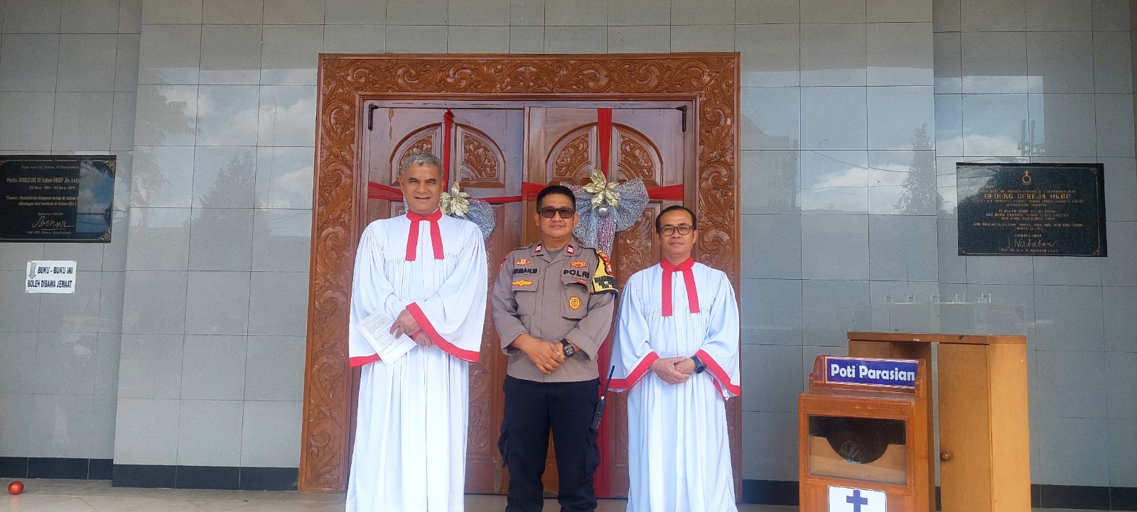 Jakarta Pusat – Bhabinkamtibmas Kelurahan Cempaka Baru Aiptu Firman Amankan Perayaan Natal di Gereja HKBP Jl. Swadaya V Rw. 04 Kelurahan Cempaka Baru Kemayoran Jakarta Pusat. Rabu (01/01/2025)