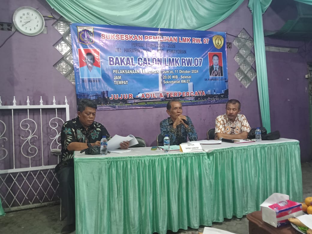Kegiatan pemilihan LMK dihadiri oleh Lurah, Babinsa, Bhabinkamtibmas, Ketua RW 07, Tokoh Masyarakat, Para Ketua RT di RW 07 dan warga RW 07.