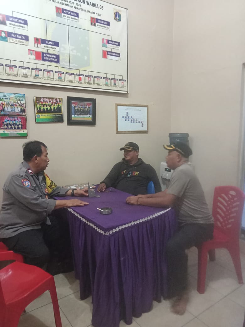 Selanjutnya Aiptu Bambang Budiyono bertemu dengan Bpk. Rokib dan Bpk. Tedi selaku awak kamling, guna mendengar saran dan masukan terkait situasi Kamtibmas di sekitar Kelurahan Harapan Mulia, Kemayoran Jakarta Pusat.