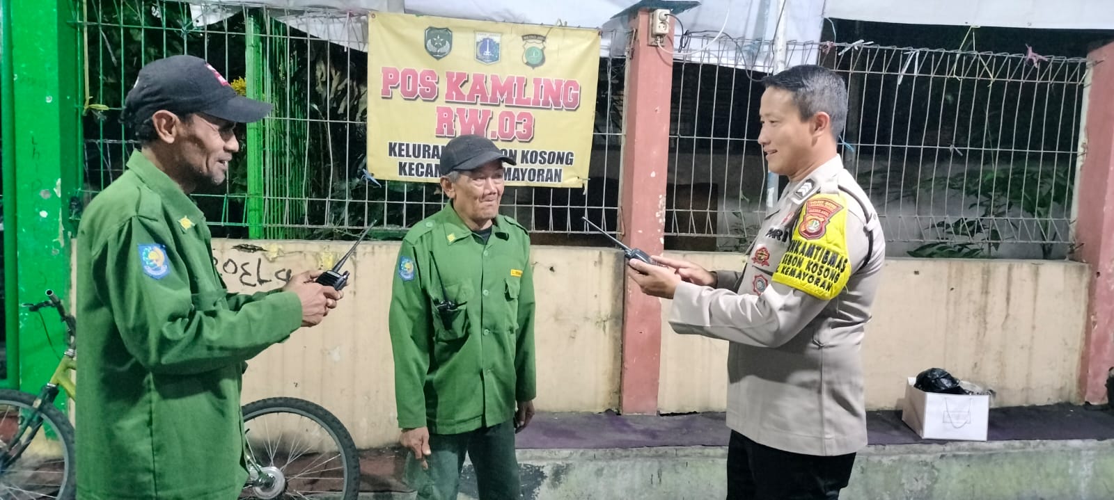 Selanjutnya Brigadir Yayat Ruhiyat bertemu dengan Bpk. Soleh & Bpk. Choky Selaku awak kamling, guna mendengar saran dan masukan terkait situasi Kamtibmas di sekitar Kelurahan Kebon Kosong, Kemayoran Jakarta Pusat.
