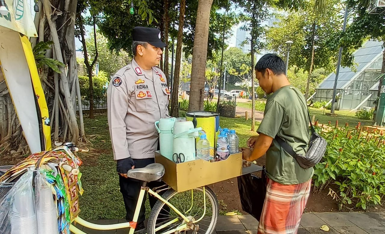 Bripka Riza melakukan patroli wilayah serta memberikan imbauan pedagang kopi bersepeda Sarhana agar berdagang bersepeda tidak menggangu warga sekitar yang menikmati lokasi taman.