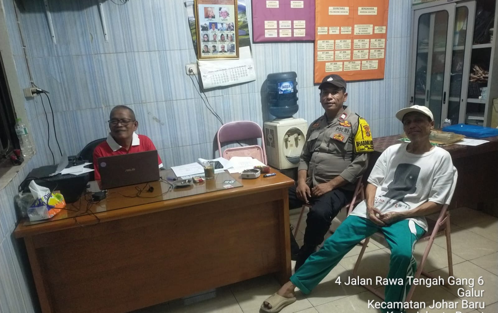 Jakarta Pusat – Bhabinkamtibmas Kelurahan Galur Aiptu Sunarto, sambang wilayah malam hari melakukan interaksi dan komunikasi sosial kamtibmas dengan Ketua RW dan Ketua RT di Pos Sekretariat RW 06 Galur, Jalan Rawa Tengah RT 08 RW 06 Kelurahan Galur, Kecamatan Johar Baru Jakarta Pusat.