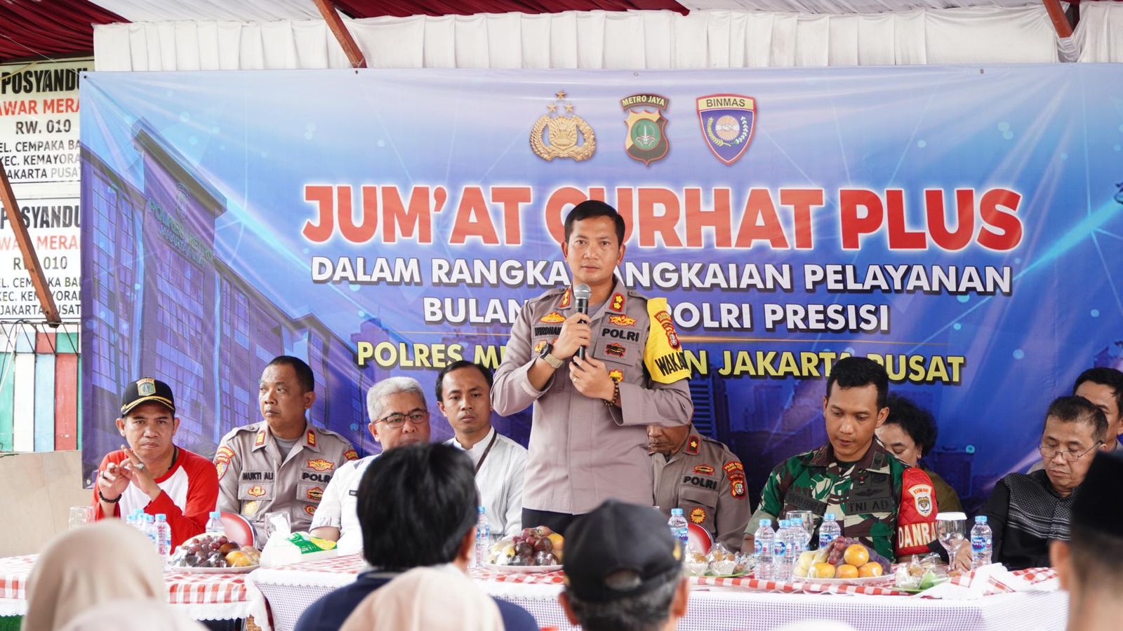 Jakarta Pusat – Wakapolres Metro Jakarta Pusat AKBP Wirdhanto Hadicaksono, SH, SIK, MSi melaksanakan kegiatan Jum’at Curhat Plus bersama warga di Pos RW 10 Jl. E Raya No. 30 RT 02/10 Kelurahan Cempaka Baru Kecamatan Kemayoran Jakarta Pusat.