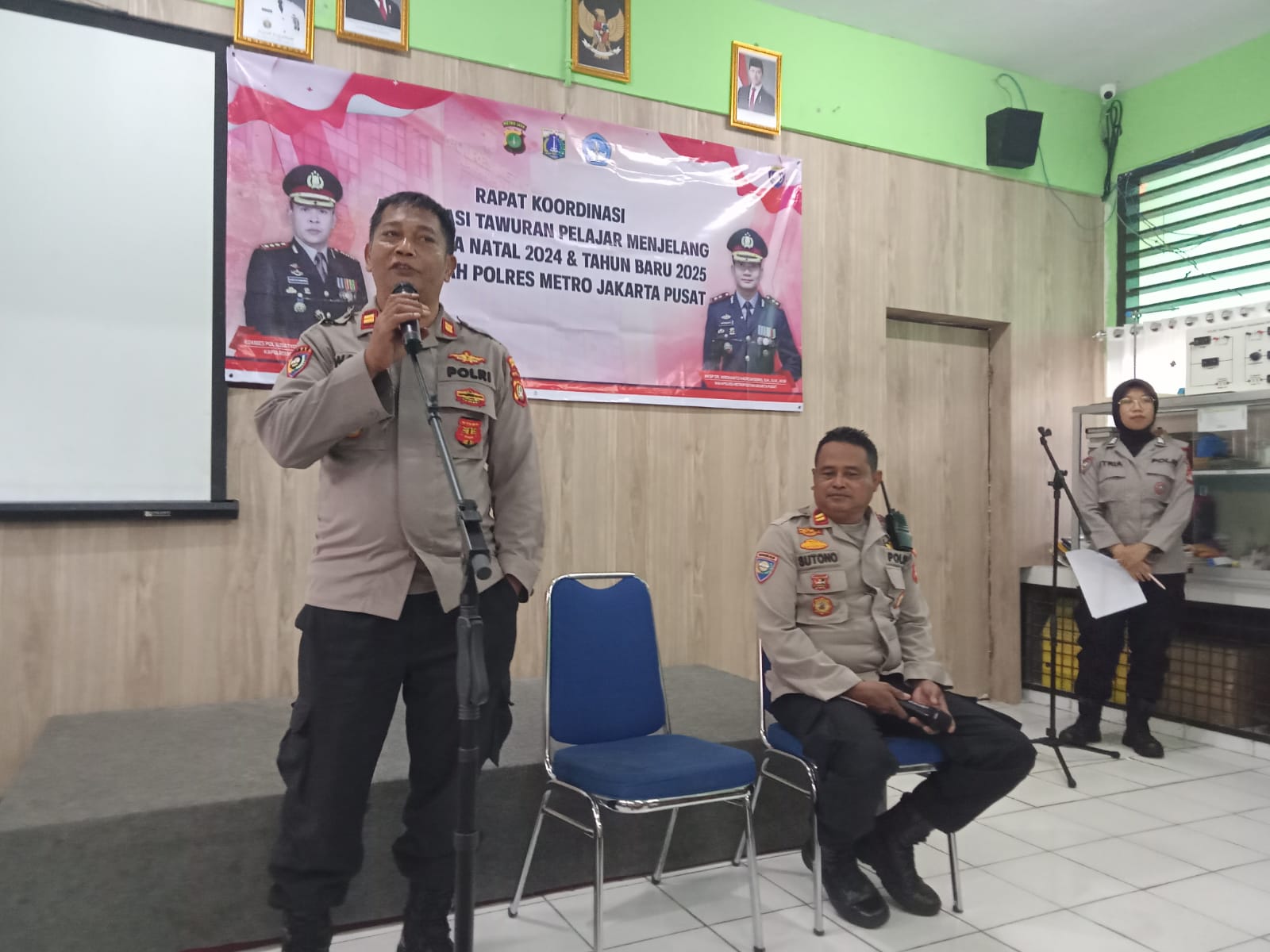 Jakarta Pusat – Kanit Binmas Polsek Kemayoran Iptu Sutono Menghadiri Rapat Koordinasi Antisipasi Tawuran Pelajar menjelang Hari Raya Natal 2024 dan Tahun Baru 2025 di SMPN 269 Jakarta, Rabu (18/12/2024).
