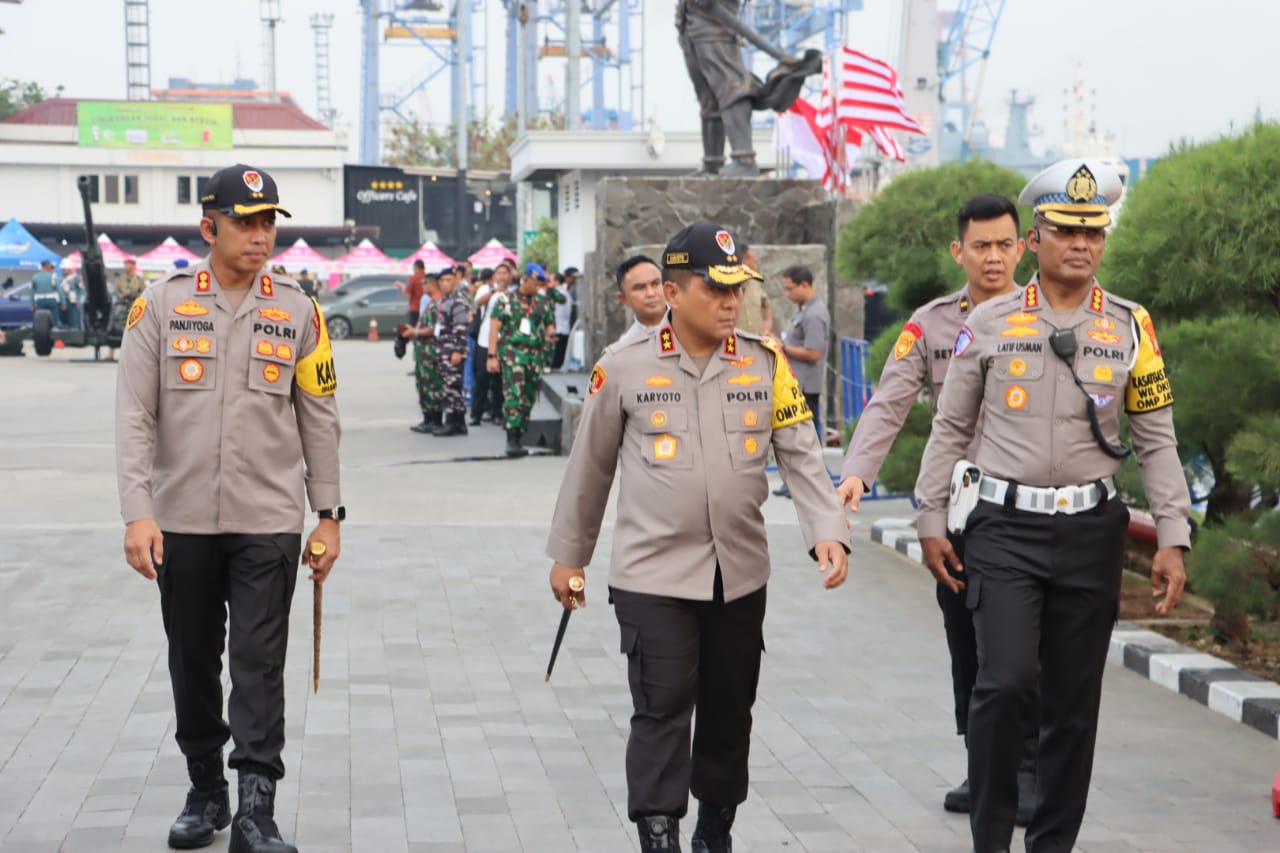 Jakarta, Kapolres Pelabuhan Tanjung Priok AKBP Indrawiennya Panjiyoga, S.H., S.I.K., dan Dandim 0502 Jakarta Utara Letkol Inf. Doni Gredinand, S.H., M.Tr. (Han)., M.I.POL., yang diikuti 224 Personel gabungan TNI – Polri, dalam pelaksanaan pengamanan kegiatan kunjungan kerja, penganugerahan tanda kehormatan Samkaryanugraha kepada KRI Nanggala-402 oleh Presiden RI dan penganugerahan brevet kehormatan Hiu Kencana kepada Presiden RI dan Wakil Presiden RI, yang dilanjutkan dengan meninjau sailing pass alutsista TNI Angkatan Laut di perairan Teluk Jakarta, Sabtu (28/09/2024), bertempat di Mako Kolinlamil Tanjung Priok Jakarta Utara.