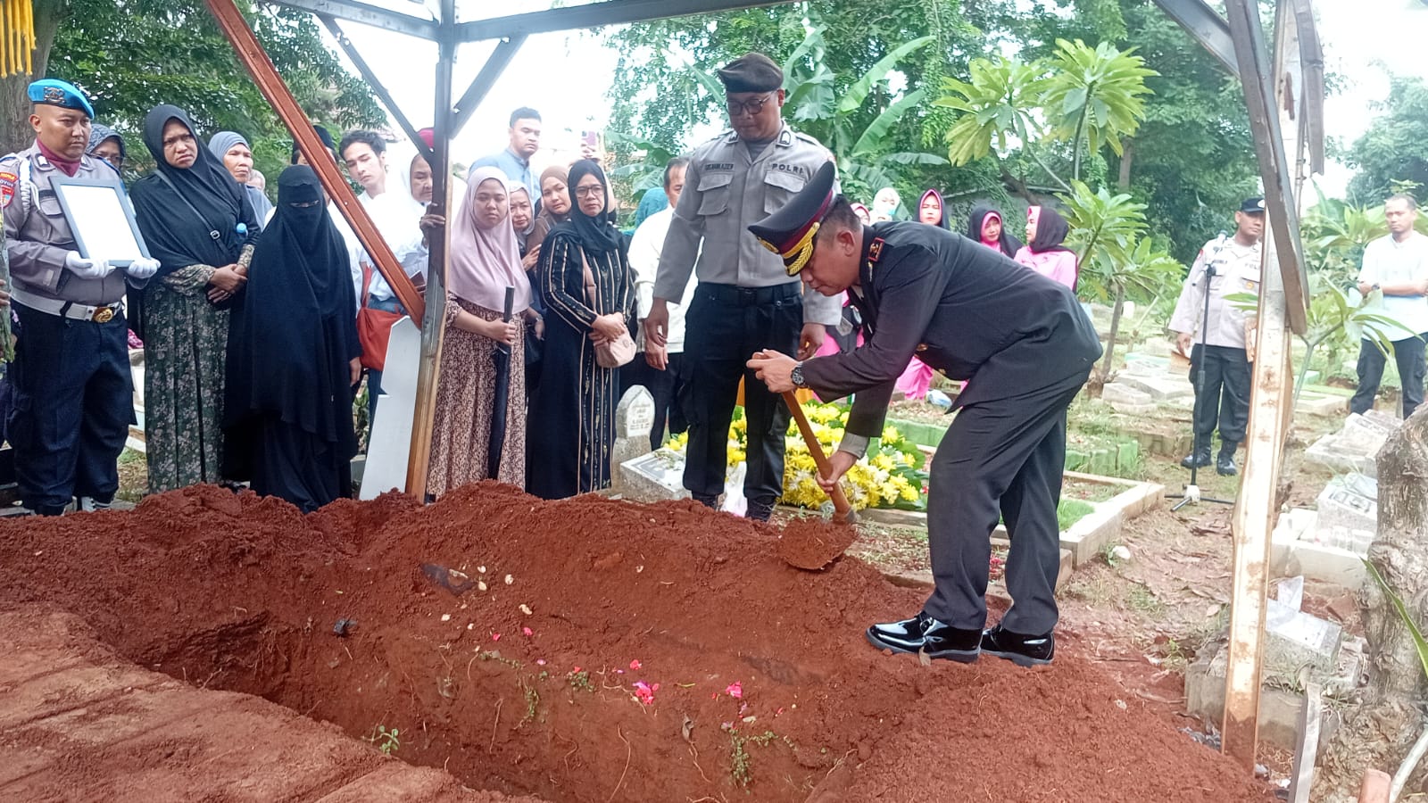 Giat upacara pemakaman diakhiri dengan penyerahan foto almarhum dan bersalaman dengan pihak keluarga sebagai rasa turut berbelasungkawa.Humas Polres Metro Jakarta Pusat.