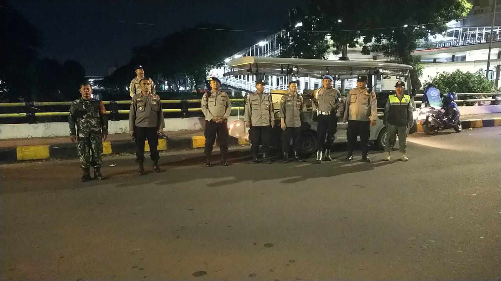 Dalam rangka menjaga keamanan dan ketertiban wilayah, patroli tiga pilar yang terdiri dari anggota TNI, Polri, dan aparat Kelurahan Menteng melaksanakan kegiatan pemantauan di sekitar perbatasan Jembatan Menteng Tenggulun, Menteng, Jakarta Pusat. Patroli yang dilakukan pada malam hari ini bertujuan untuk mengantisipasi potensi tawuran warga serta mencegah terjadinya tindak kejahatan di area tersebut.