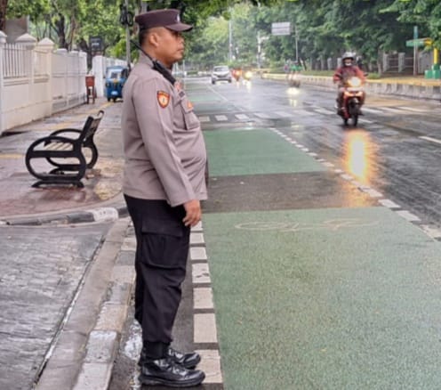 Jakarta Pusat – Panit 1 Samapta Polsek Sawah Besar, Aiptu Anwarudin melakukan pengaturan arus lalu lintas di sepanjang Jl. Banteng Utara Sawah Besar Jakarta Pusat. Senin pagi (20/1/2025)