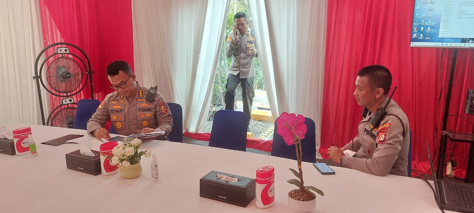 Jakarta Pusat – Kunjungan Kombespol Deddy Murti, S.IK., M.Si didampingi Wakapolsek Metro Menteng Kompol II Sutasman, S.H., M.H melaksanakan Pengecekan Pospam TriBrata Jaya KWI Menteng baik personil maupun kesiapan alat-alat pendukung kegiatan kunjungan Bapa Paus Fransiscus ke Gedung KWI Kelurahan Cikini Menteng, Jakarta Pusat. Rabu (4/9/2024).
