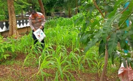AKP Mara Oloan Hasibuan bersama Panit Binmas Aiptu Purwanto melakukan pemupukan, penyiraman, dan pembersihan gulma di sekitar tanaman jagung. Perawatan rutin ini dilakukan agar tanaman tumbuh optimal dan menghasilkan panen yang memuaskan.