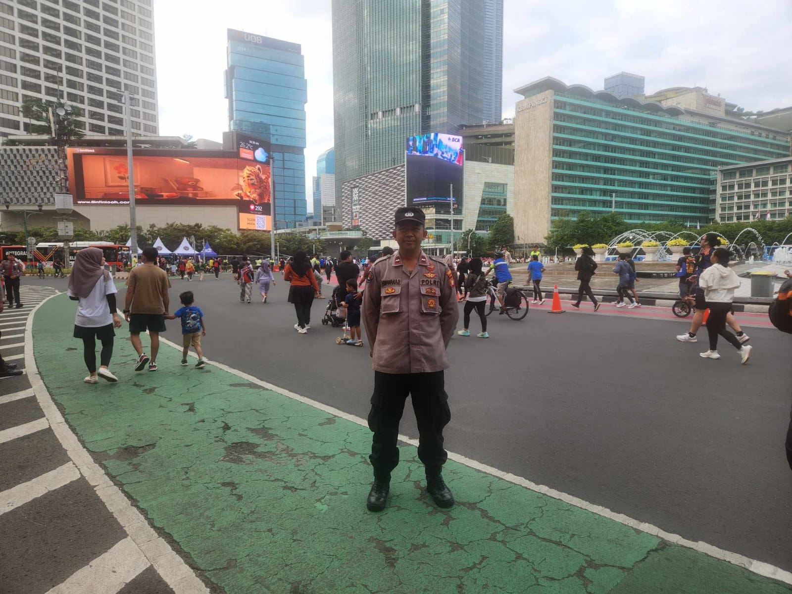 Pada hari Minggu pagi yang cerah, Aipda Himawan, personel Humas Polsek Menteng, melaksanakan pemantauan giat olahraga pagi di area Car Free Day (CFD) Bundaran HI, Jalan MH Thamrin, Menteng, Jakarta Pusat. Kegiatan ini merupakan bagian dari tugas rutin dalam rangka memastikan situasi yang aman dan kondusif di tengah keramaian masyarakat yang memanfaatkan momen CFD untuk berolahraga atau sekadar bersantai bersama keluarga.