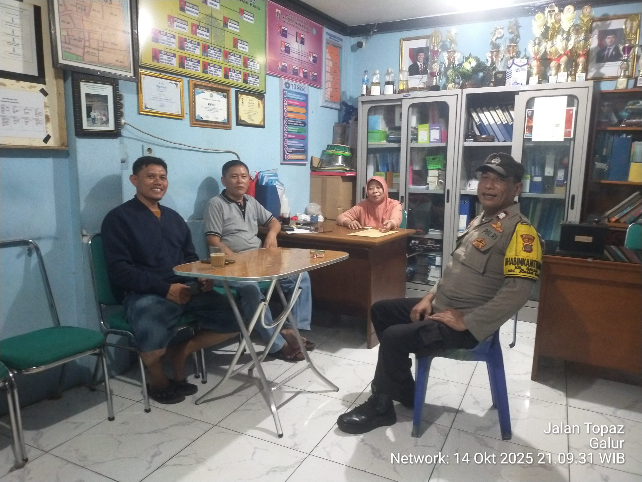 Tempojakarta.id,Jakarta Pusat – Dalam rangka mempererat kemitraan antara polisi dan masyarakat, Bhabinkamtibmas Kelurahan Galur, Aiptu Baktiar, melaksanakan kegiatan sambang dan dialogis di Pos Kamling Balai Warga RW 03, Jalan Topaz, Kelurahan Galur, Kecamatan Johar Baru,(15/10/2025).