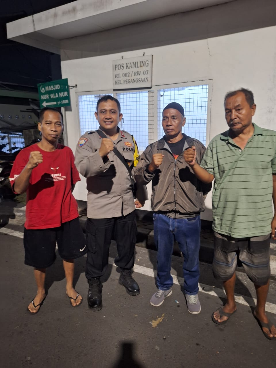 Dalam kegiatan tersebut, Aipda H.M. Adhy M.N. bertemu langsung dengan Ketua RW 07, Bapak Zulfikar, bersama sejumlah warga yang sedang melaksanakan ronda malam. Suasana penuh keakraban tampak dalam dialog yang berlangsung, di mana Bhabinkamtibmas menyampaikan pesan-pesan kamtibmas agar seluruh warga senantiasa waspada terhadap potensi tindak kejahatan di lingkungan sekitar.