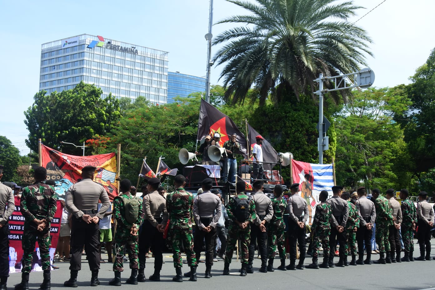 Pengamanan dilakukan dengan pendekatan humanis, mengedepankan pelayanan kepada masyarakat untuk memastikan aksi berjalan kondusif dan tertib. Aparat gabungan terlihat mengawal jalannya aksi dengan profesional tanpa mengganggu aktivitas warga sekitar.