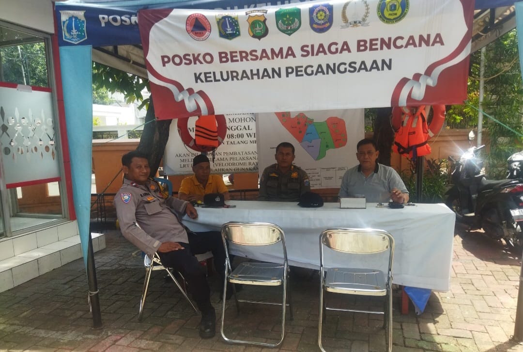 Jakarta Pusat – Bhabinkamtibmas Pegangsaan Aipda Anwar bersama Satpol pp dan LMK serta FKDM di Posko Bersama Siaga Bencana Kelurahan Pegangsaan Menteng Jakarta Pusat. Jumat (10/01/2025)