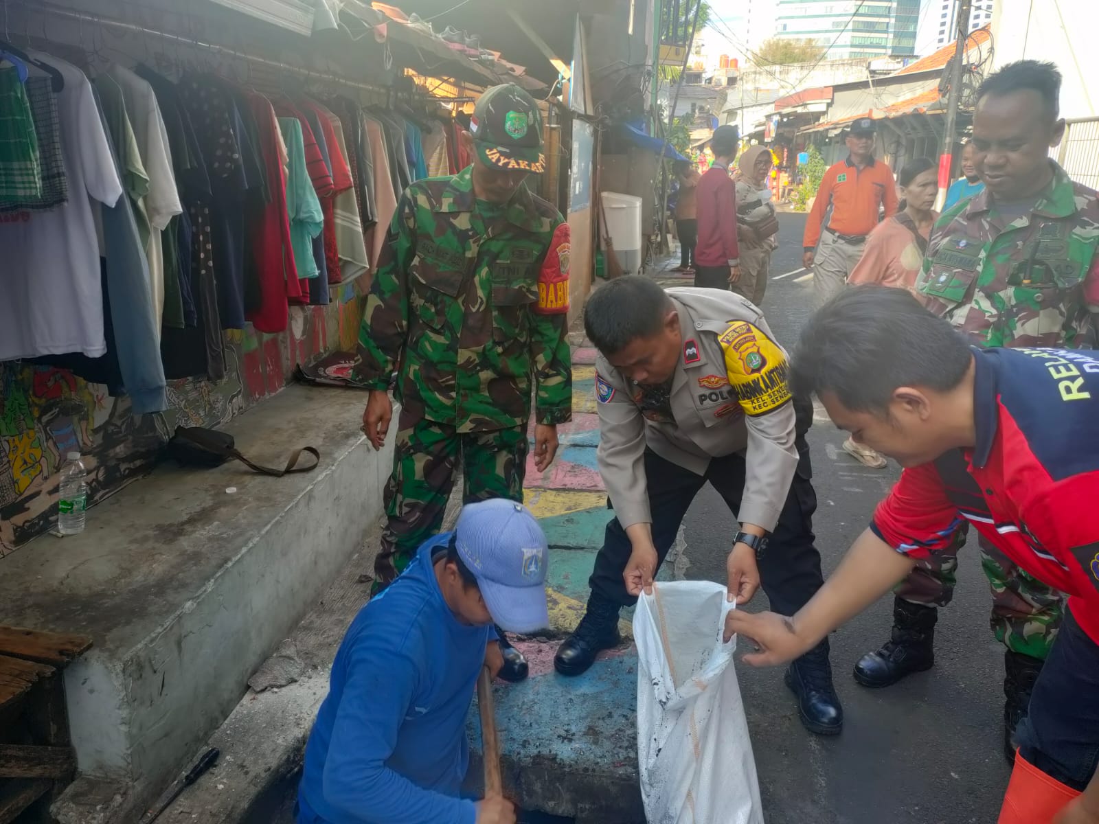 Jakarta Pusat – Bhabinkamtibmas Kelurahan Senen Aipda Marzuki bersama Tiga Pilar Kecamatan Senen Melaksanakan Kerja Bakti Grebek Lumpur dalam rangka Antisipasi Banjir dimusim penghujan Wilayah Kelurahan senen Kota Jakarta Pusat di Jalan Pasar Senen Dalam 5 RW 04 Kelurahan Senen Kota Jakarta Pusat. Minggu (05/1/2025).
