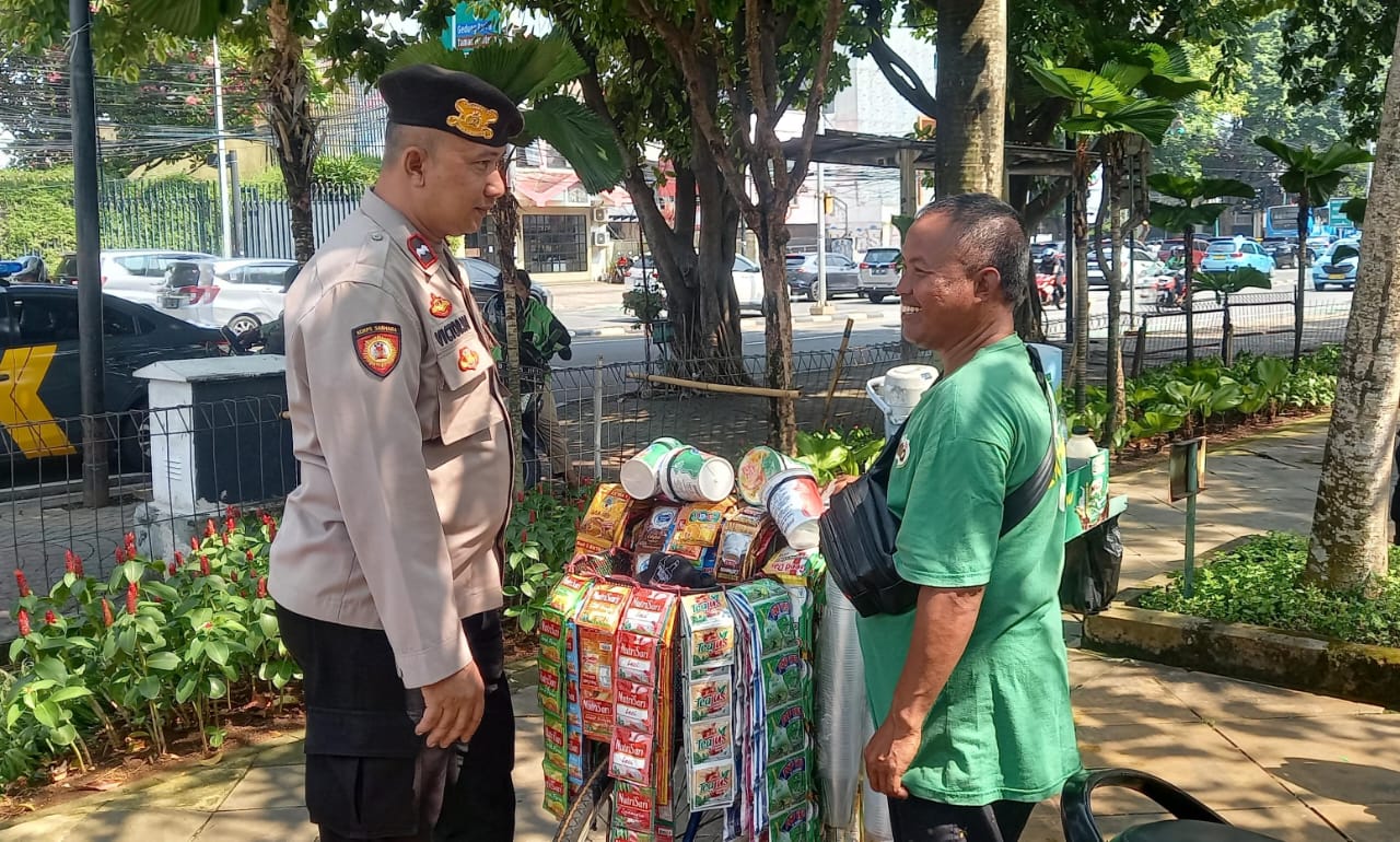 Jakarta Pusat – Aiptu Victor personil Patmor Polsek Metro Menteng melaksanakan imbauan pedagang sekitar Taman Lembang Menteng, Jakarta Pusat. Jumat, (27/9/2024).