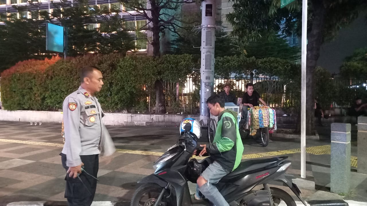 Jakarta Pusat – Iptu Aang Suryana Kapolsubsektor Thamrin bersama Tiga Pilar Menteng Membubarkan Kendaraan yang mangkal sekitar bunderan hotel Indonesia Menteng, Jakarta Pusat. Sabtu (28/9/2024).