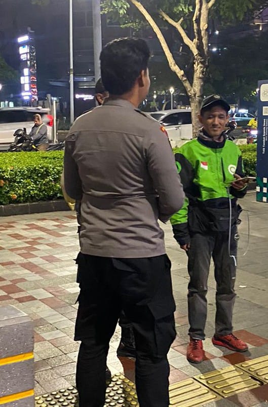 Bripda Bagus selaku Petugas Patroli 1052 melaksanakan patroli dan strong Point di sepanjang Jalan Jenderal Sudirman berikan imbauan kepada pengemudi Ojol agar selalu menjaga keamanan dan ketertiban, agar selalu patuhi rambu arus lalu lintas, utamakan keselamatan penumpang serta menjelang Pilkada agar tetap menjaga kerukunan walaupun beda pilihan.