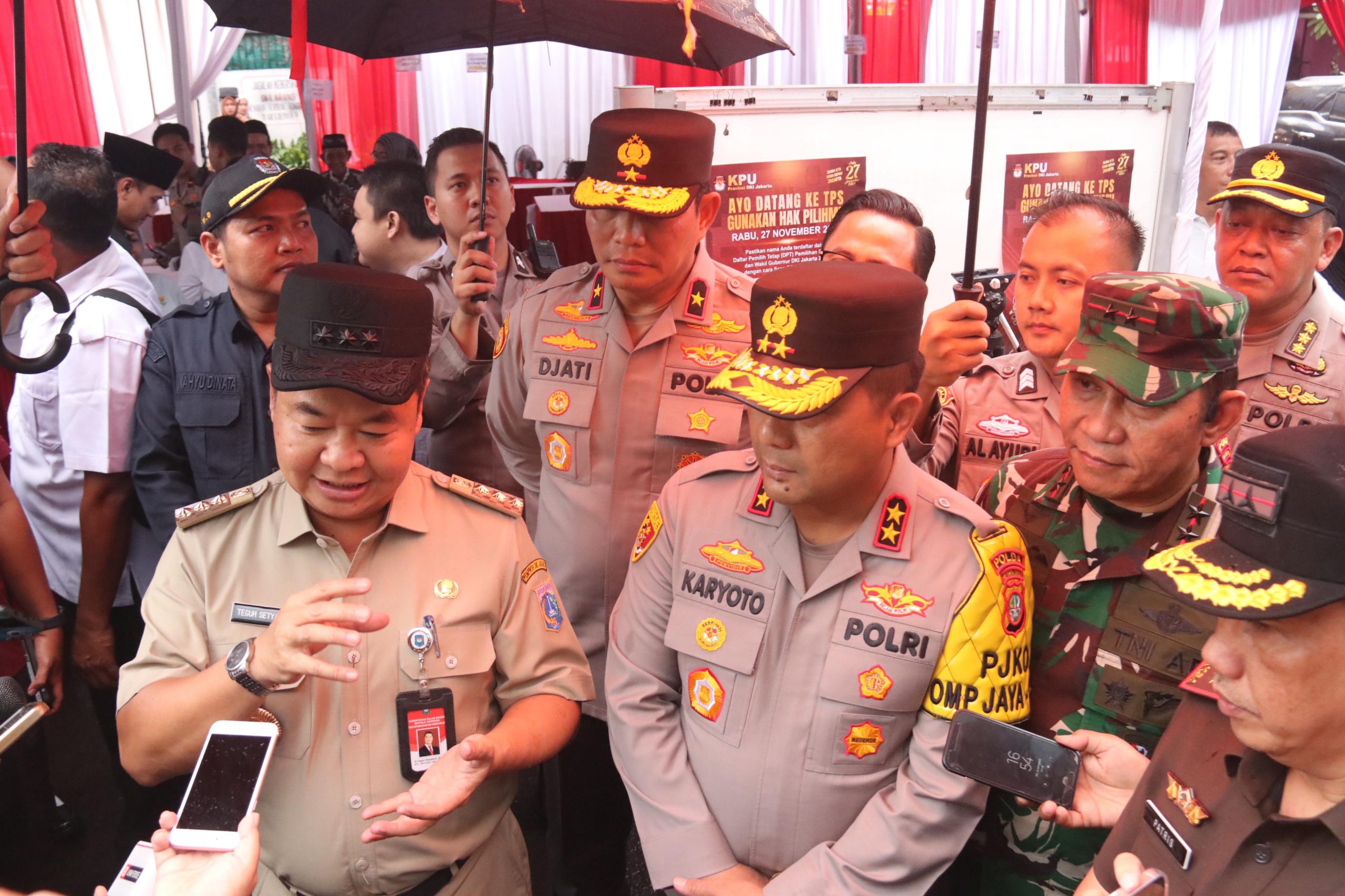 Rombongan memulai peninjauan di TPS 23 depan Asrama Brimob KS Tubun, Jakarta Barat. Pj Gubernur, Kapolda, dan Pangdam didampingi Ketua KPU DKI Wahyu Dinata, Ketua Bawaslu DKI Munandar Nugraha, dan Sekda DKI Marulli Matali.