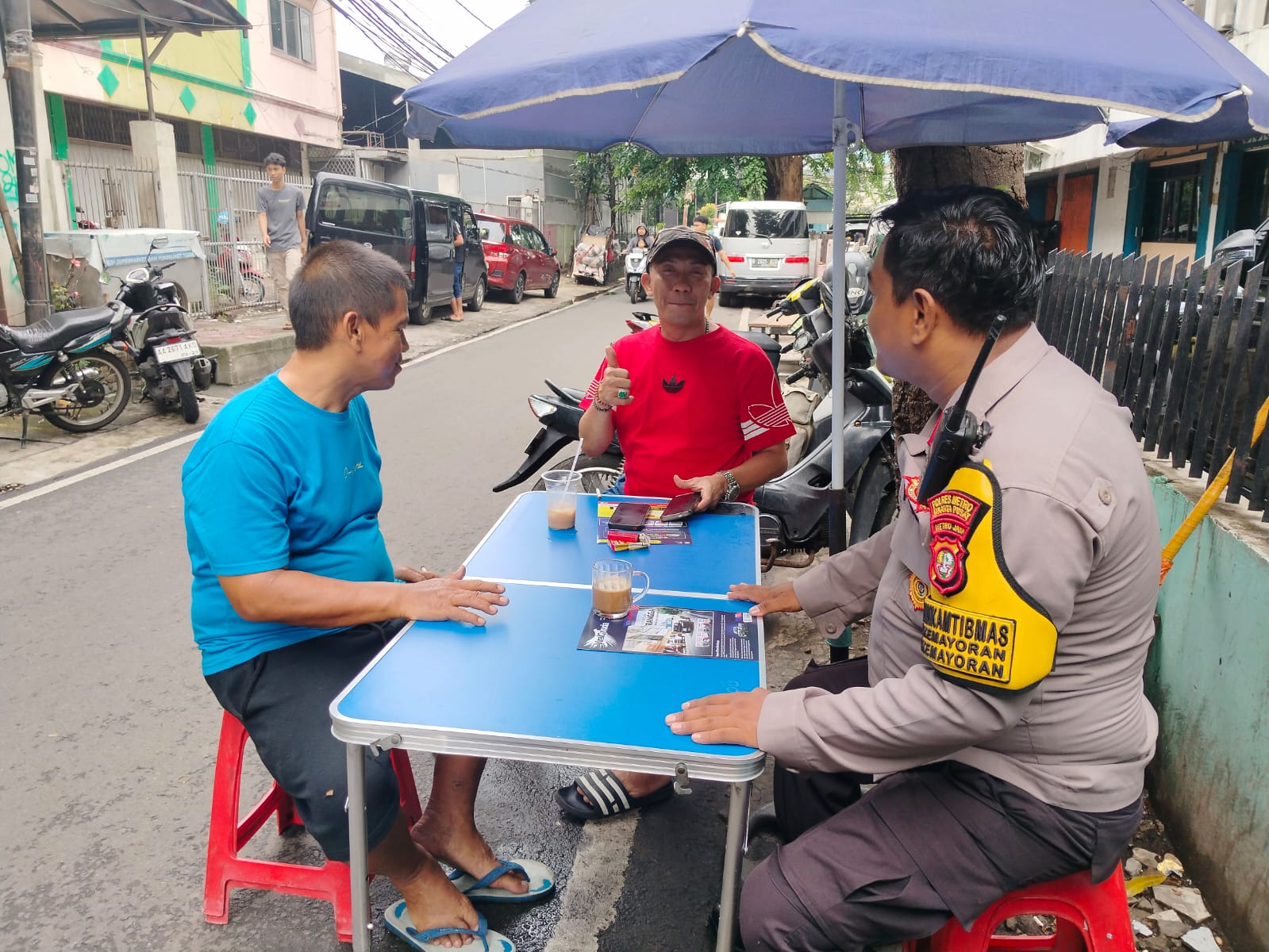 Bertempat di Jalan Kemayoran Utara, Aiptu Dwi berjumpa dengan Bapak Supri dan Bapak Andi, dua tokoh masyarakat, dalam suasana hangat sambil menikmati secangkir kopi bersama. Momen santai ini menjadi sarana efektif untuk berdialog dan bertukar informasi seputar keamanan lingkungan.